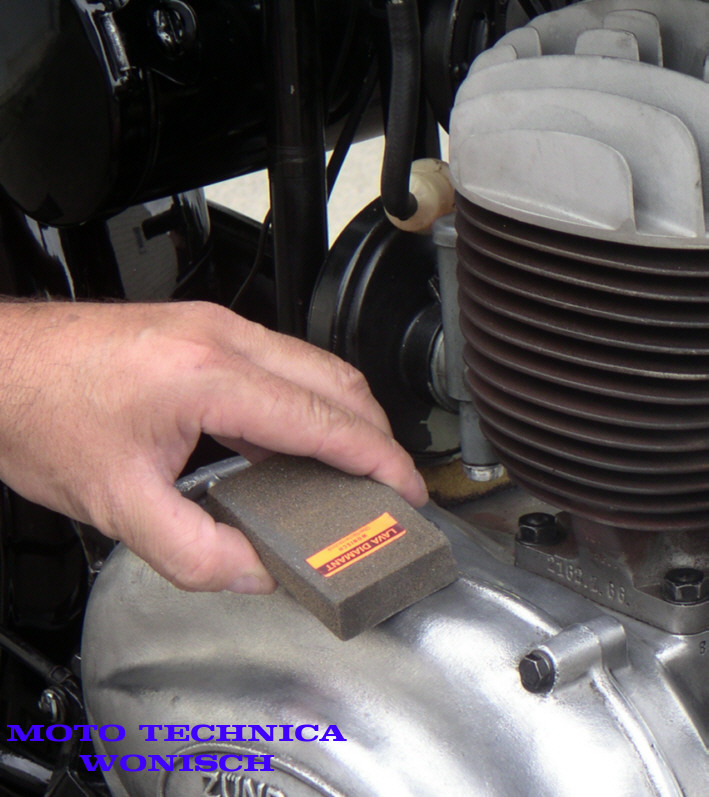Tipp : benutzen Sie am besten kurz immer den feinsten am Material zuerst um anzutesten, dann gröber werden wenns nötig wird. So spart man sich je nach Wirkungsweise evtl. 1 oder 2 Arbeitsgänge. Oftmals genügt zu Beginn der sehr feine 240er oder der 120er dann feiner werden und Polieren. Sollte noch weitere Verschmutzung nicht weggehen oder gröber nötig werden bei z.B. sehr starker Oxydation oder Korrosion dann den 60er einsetzen und mit 120 und 240 nacharbeiten. Zum Schluss wenn Glanz erwünscht ist wieder Ecromal.